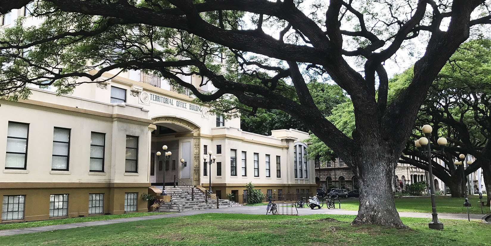 Front of the Kekuanaoa Building with a grassy area and large tree in the foreground.